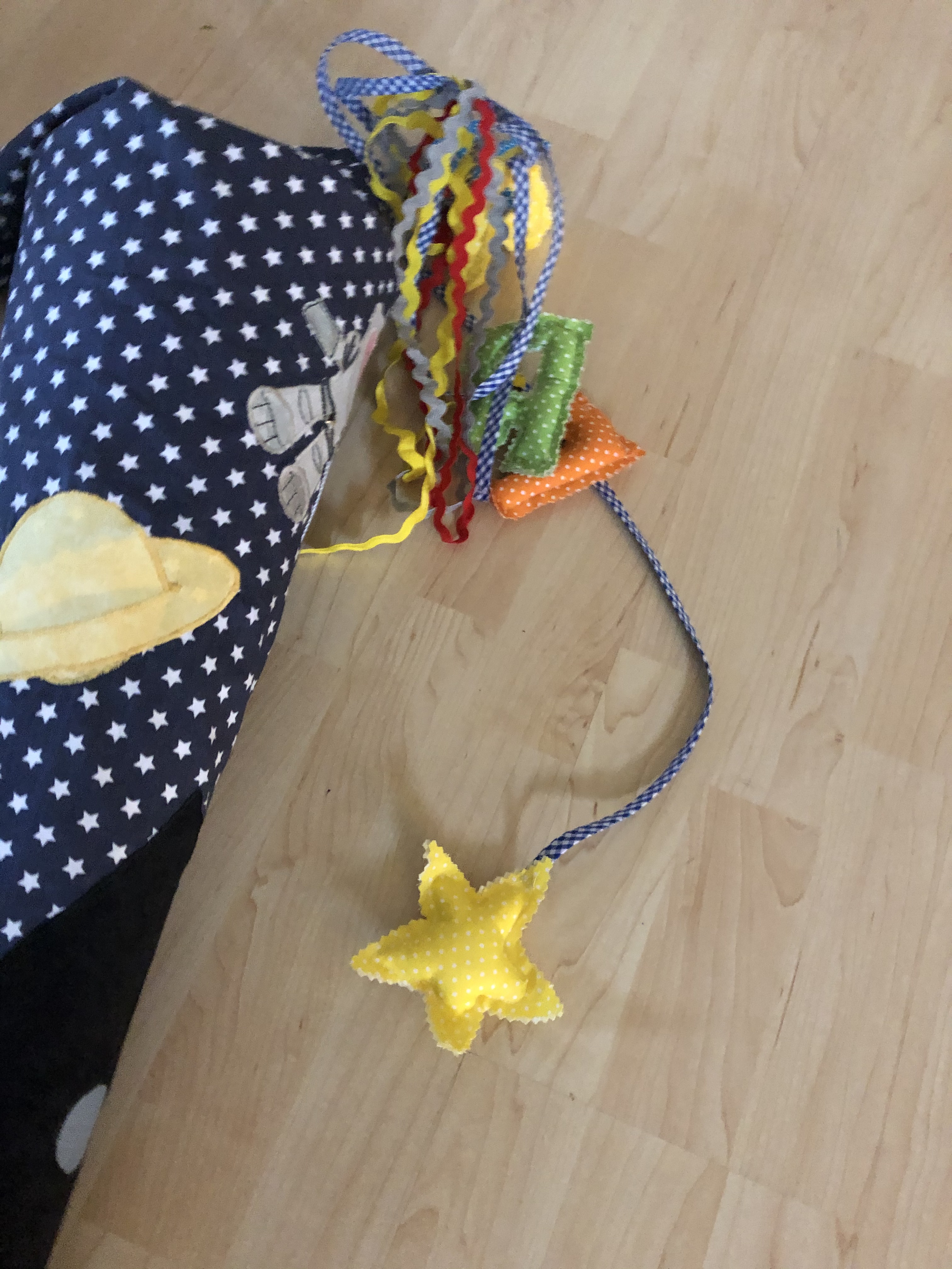 Die Schultüte für den Blondino habe ich bei Anja bestellt. Es ist eine Rakete mit Astronat. Mittlerweile ist es ein Kuschelkissen. Zugebunden wird die Rakete mit Zackenlitze, an der gesteppt die Buchstaben des Namens hängen.