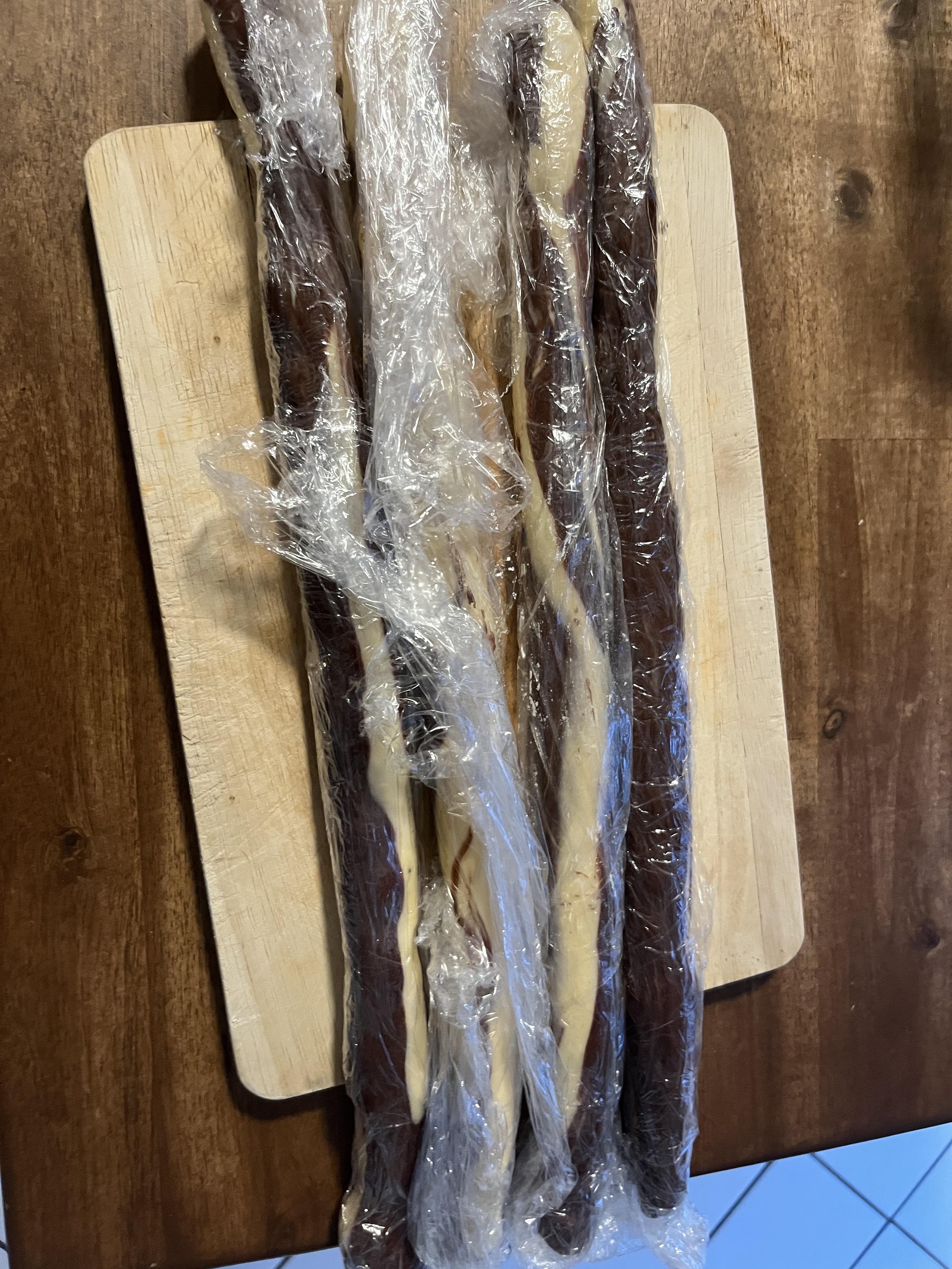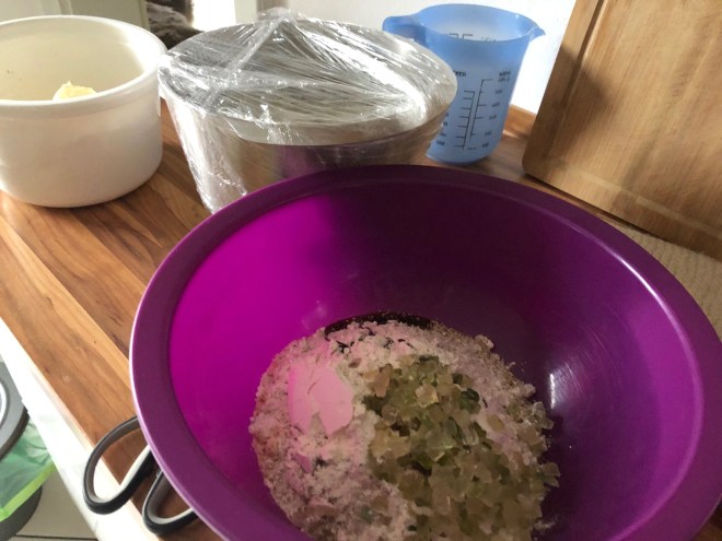 … Stollenteig zusammengerührt (Es ist höchste Zeit; im übrigen habe ich drei volle Packungen Sternanis in meiner Rabusche gefunden. Sollte jemand engpassen von euch, bitte melden!)