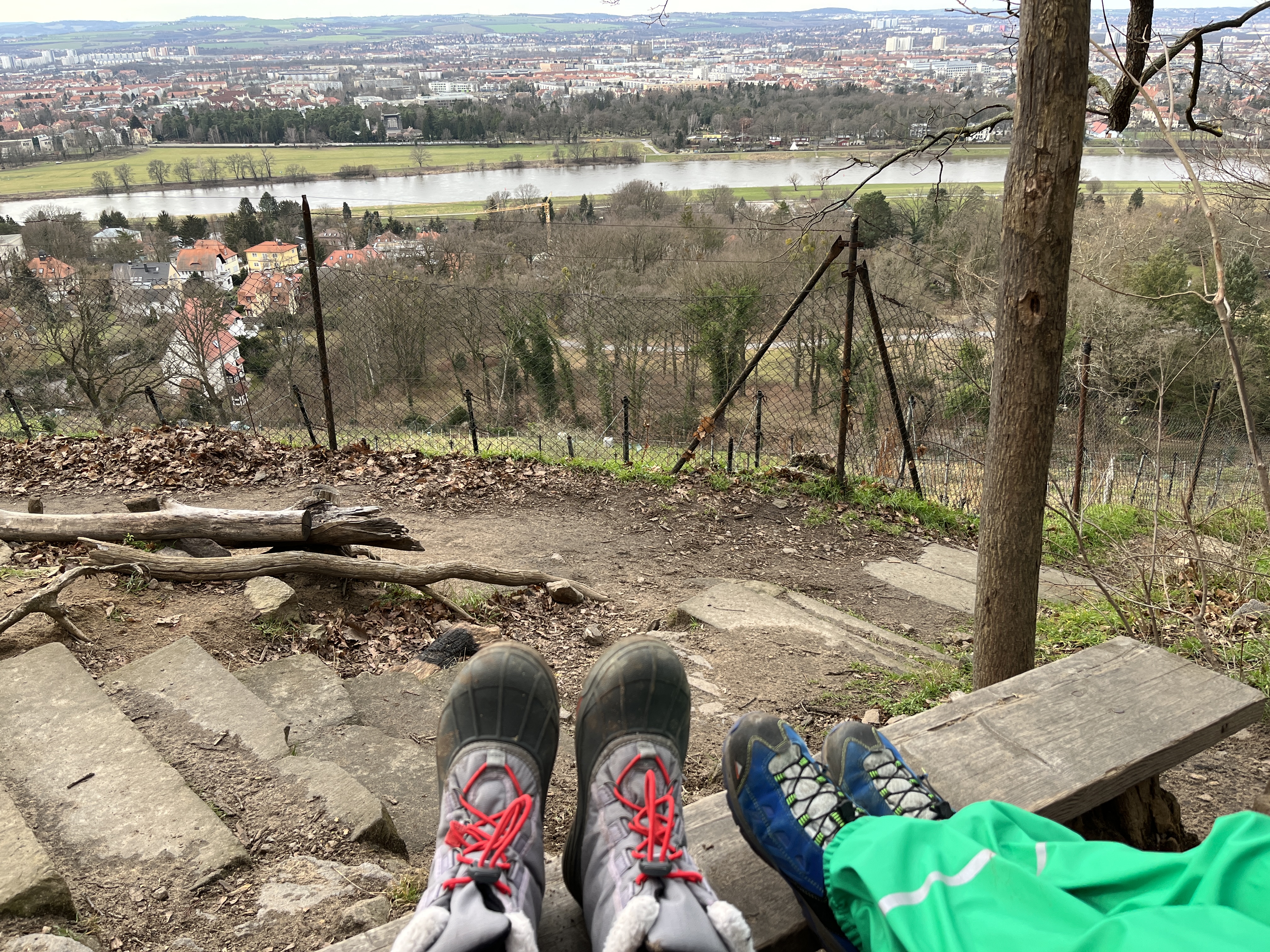 Nun, ich weiß ja nicht, wie eure Kinder sind, dieses ist so: Kind hält Schirm und läuft nicht. Ich nehme Schirm, Kind läuft. Kind hält Schirm, steht. Ich trage Schirm, Kind geht. Vermutlich kann es entweder halten oder laufen, dieses Kind hier. Es ist wohl defekt, aber Zeitdruck im Genick, also trage ich den Schirm über Haupt und Ranzen des Jungen und eskortiere ihn so zur Schule. Ja. Und dann Wägnerstraße, eine von vielen schmalen Wegen im beschaulichen Blasewitz, da können nicht zwei Personen nebeneinander laufen. Ich gehe – und das Bild stellt ihr euch mal genauso vor- also hinter dem Jungen und halte einen Schirm über ihn! Diese Situation erinnerte mich drastisch an alte Gemälde, wo irgendeine Durchlaucht von einer Person hinter ihr mit einem Palmwedel beschattet wird! Das war sogar für mich zu viel. Gut, auf dem Rückweg kam mir eine Mutter mit Baboe Lasterad entgegen, die einen etwa zwölfjährigen Jungen – eingequetscht wie ein Shrimp – in ihrem Lastenrad durch die Gegend fuhr. Da habe ich mich gleich besser gefühlt.