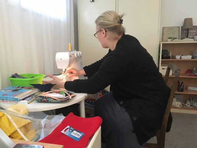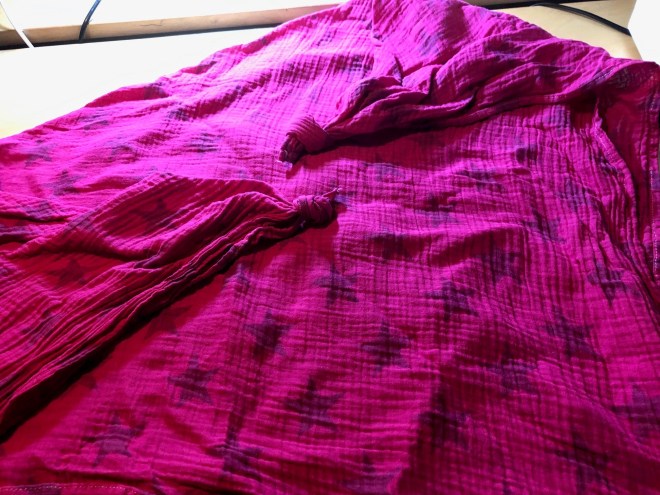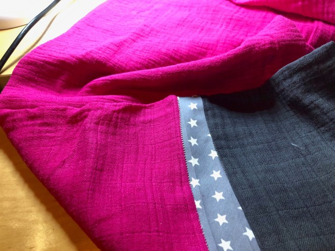 … und im Anschluss daran das „Schlupfloch“ geschlossen. Wenn ihr einen gleichmäßig breiten Streifen Bündchenstoff nehmt, wird eures auch nicht so schief wie meins. 😉