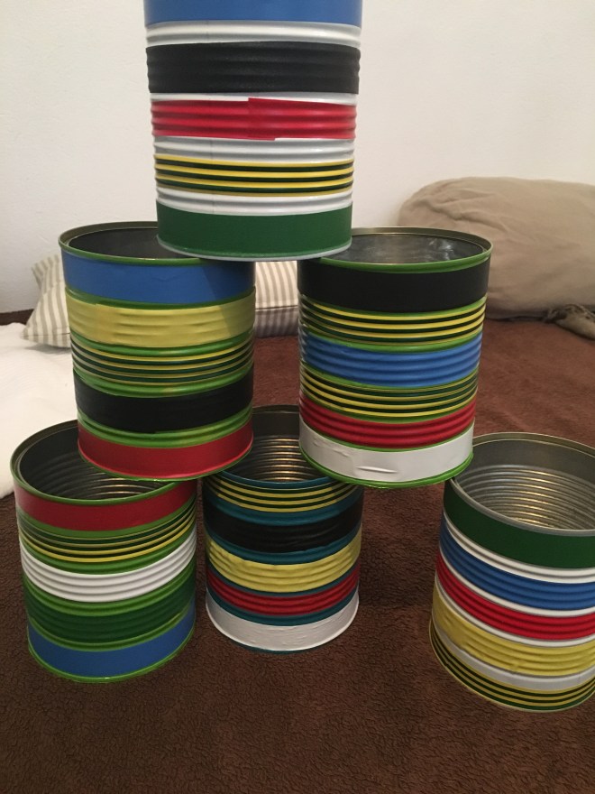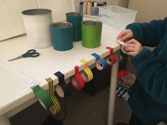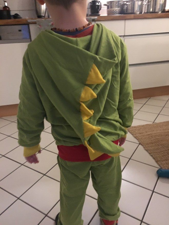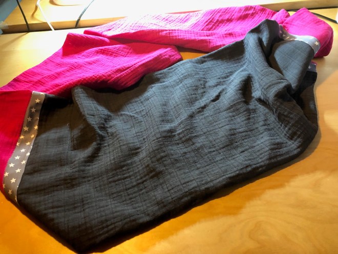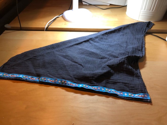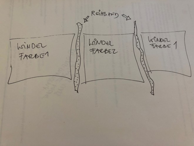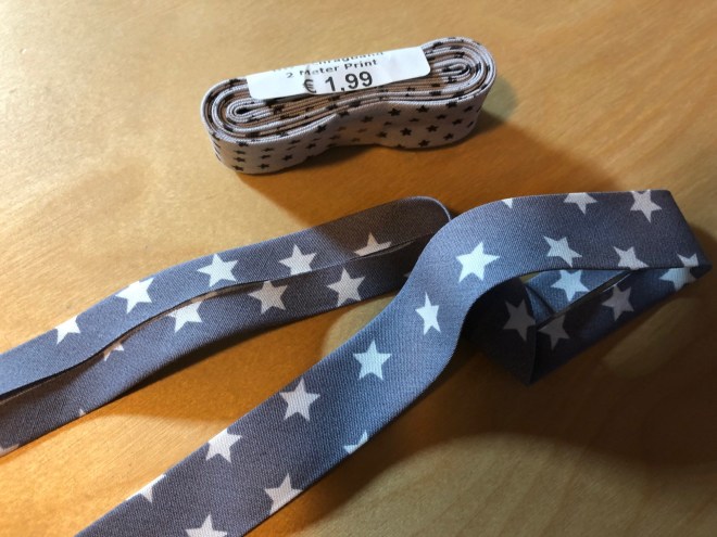 Als nächstes habe ich ein Zierband quer drüber genäht. Schief, versteht sich, ich konnte die Stecknadeln nicht finden! Eine hübsche Applikation wäre bestimmt auch ganz niedlich oder man könnte diese Aufbügelmotive endlich mal verarbeiten, die eh nur rumliegen in der Nähkiste…