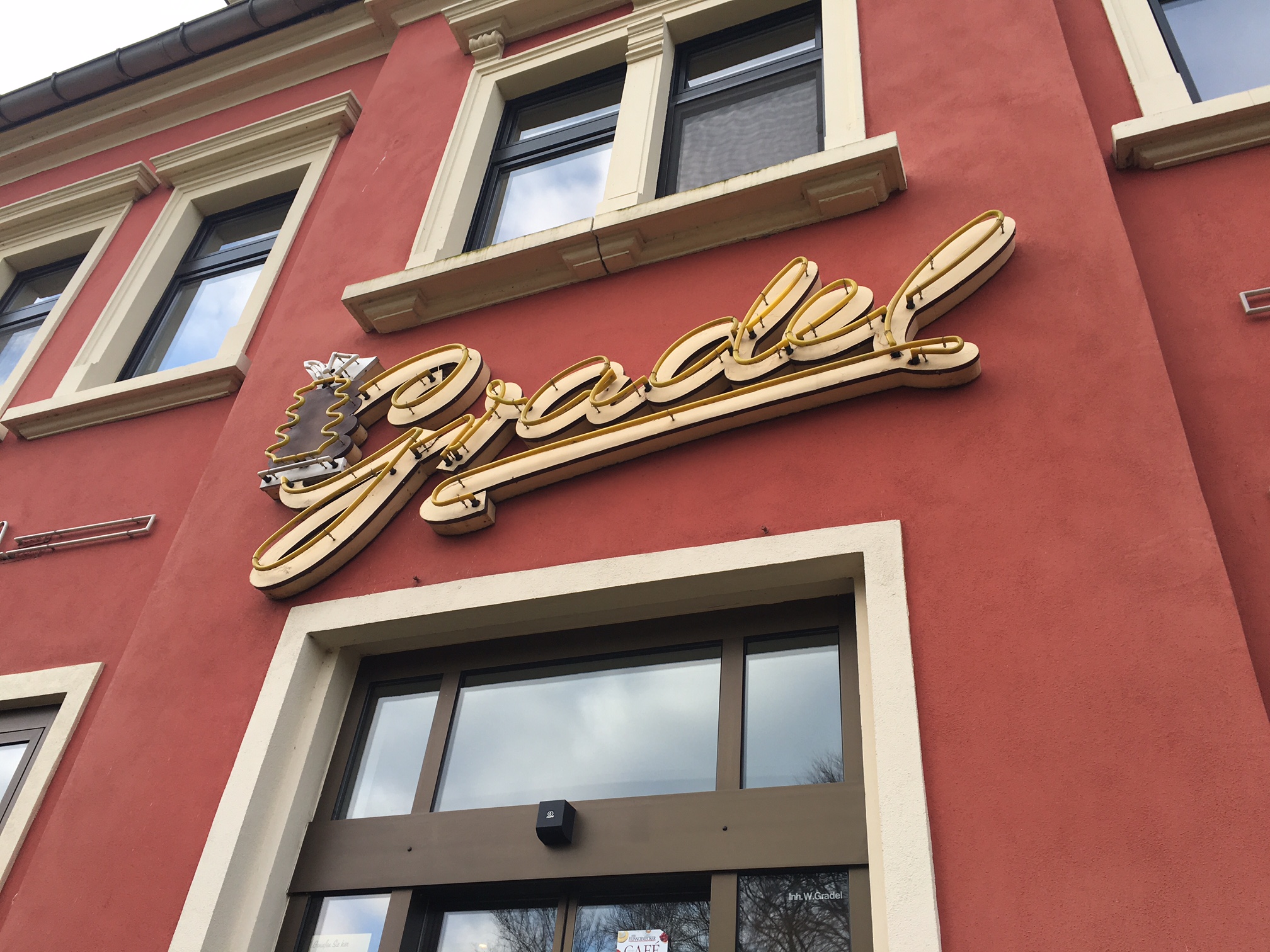 Immer wenn ich nach Tolkewitz fahre, muss ich bei Gradels anhalten. Ich bin dort in der Gegend aufgewachsen und schon Anjang der Siebzigerjahre stand Frau Gradel mit ihrer Bienenkorbfrisur hinter der Theke mit den Torten und Trüffeln. Dort steht sie noch immer, scheinbar alterslos, und verkauft den allerbesten Stoff der Stadt! Und nein, es gibt nirgendwo eine Netto- oder Rewe-Shop-in-Shop-Filiale. Für die Mocca-Buttercreme-Baisers muss man eben nach Dresden Tolkewitz kommen.