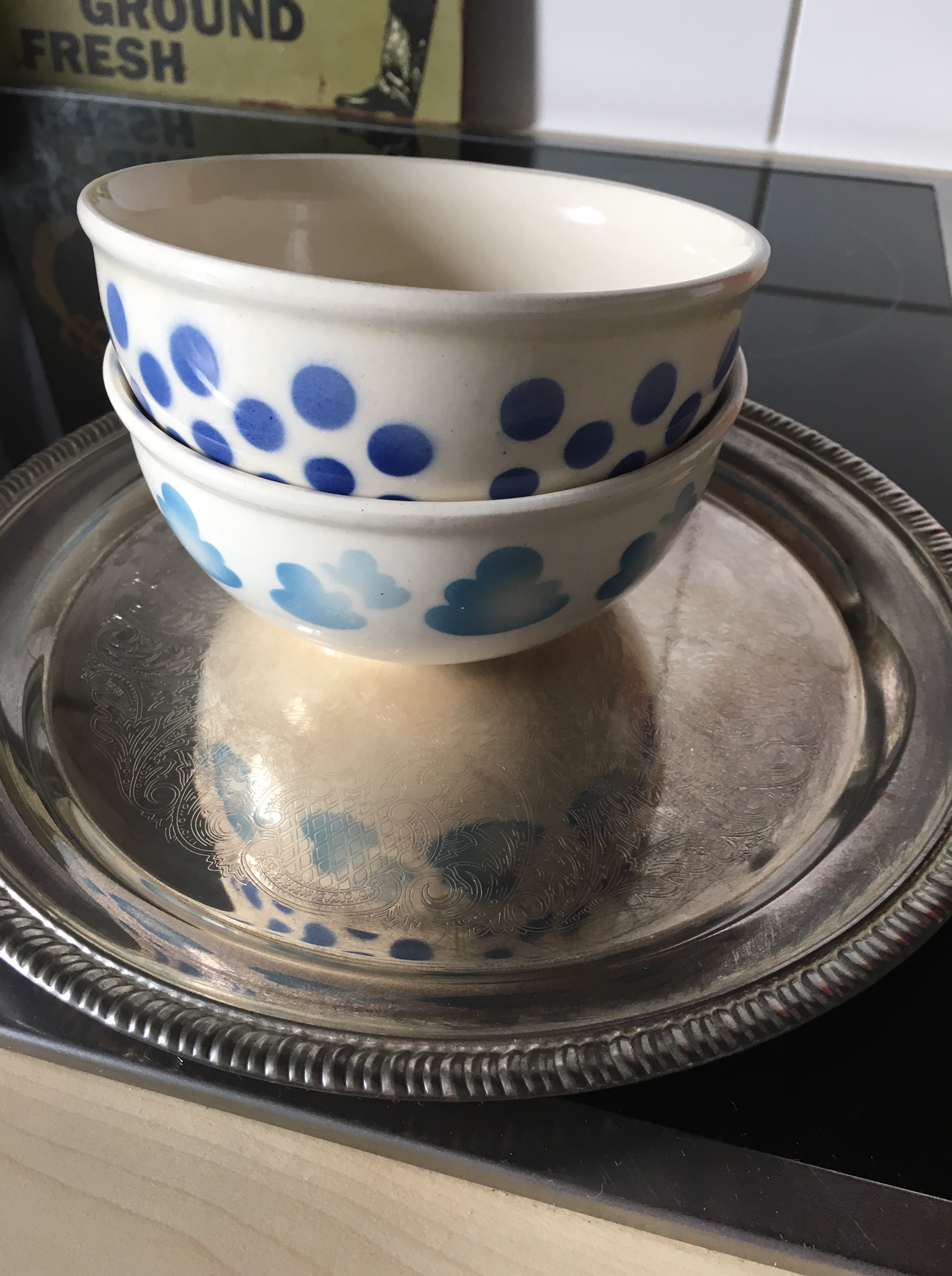 Der Bärtige hat immer hektische Flecken, wenn ich mit Gretel unterwegs war, weil ich dann stets mit Tüten und Körben voller Trödel (Schätze) heimkomme. Diesmal war ich im Anschluss alleine noch beim Trödel. Für die Freundin hab ich zwei alte Zuckerzangen erstanden und für mich zwei Keramikschüsseln von Colditz und ein angelaufenes Silbertablett. Ich steh auf alte DDR-Keramik und angelaufene Silbertabletts kann man nie genug haben! Da kann man Kerzenständer drauf gruppieren, Blumenvasen, einen Blumentopf, ein Tellerchen mit Gebäck… (Der Mann wird durch diesen Beitrag erst erfahren, dass wir diese Dinge nun besitzen. Er wird sich sehr freuen. Eher so nach innen.).