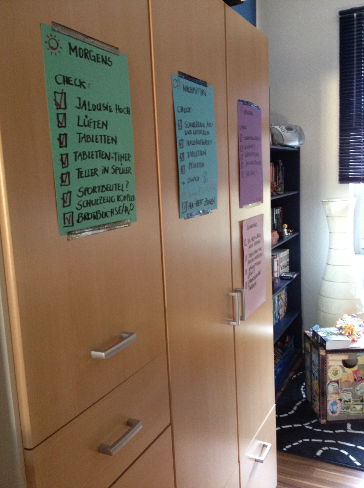 (Zu Hause ist das die Aufgabe von uns Eltern, aber im Schulalltag kann das nicht von den Pädagogen geleistet werden, die Zeit fehlt einfach. Selbst wenn ein Schüler einen Integrationsstatus hat (das hat nichts mit dem Integrationshelfer zu tun, das ist ein vollkommen anderer Prozess und ein anderer Kostenträger), bedeutet das im Regelfall, dass der Schule durch die Bildungsagentur eine bestimmte Anzahl an zusätzlichen Wochenstunden genehmigt wird, die zur Förderung des Schülers verwendet werden können. In unserem Fall hätte das nie und nimmer gelangt, dazu sind die Schwierigkeiten zu komplex.)