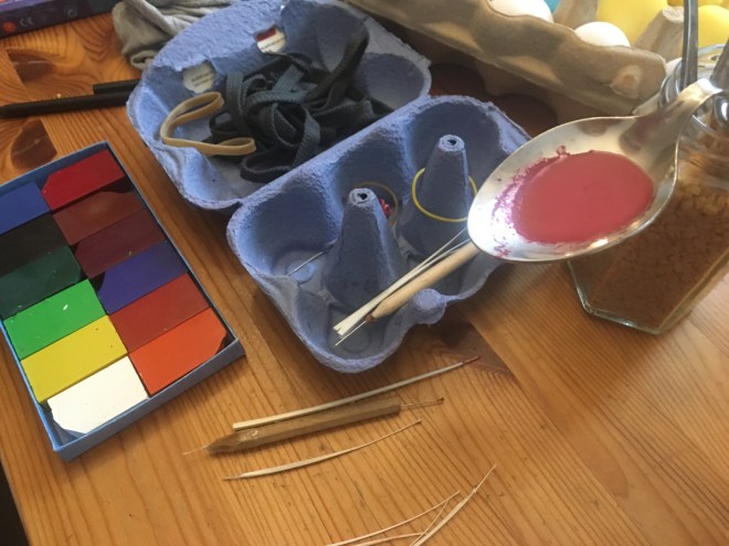 Ich lernte noch, es gäbe verschiedene Praktiken. Zum einen kann man mit dem farbigen Wachs Farbe auf das Ei bringen und das ist dann der Schmuck. Man kann aber auch mit dem Wachs Muster aufbringen, das Ei dann einfärben und im Anschluss das Wachs wieder abkratzen und ebenso weiterverarbeiten in mehreren Etappen. Die „bloße“ Stelle ergibt dann das Muster. Auf dem Bild unten mit den bunten Eiern im Karton hier ist das Ei oben rechts genauso entstanden.