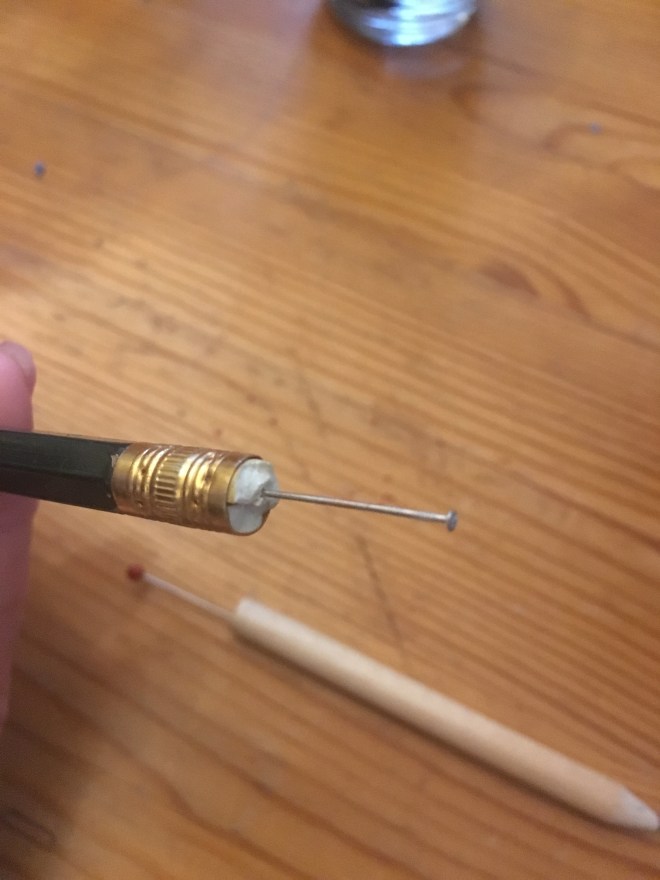 Auch das ist ein Werkzeug zum Zeichnen: Eine Stecknadel in zweierlei Form in einen Stift gespießt ergibt am Ende auf dem Ei ein Pünktchenmuster