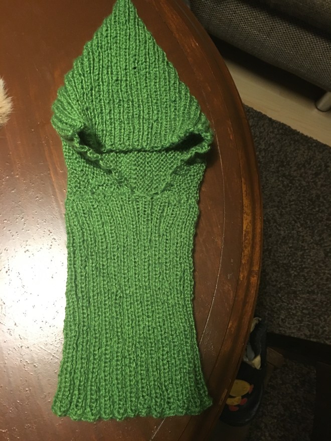 Danach habe ich es eine Nummer kleiner probiert: Einhundertzwanzig Maschen. In Grün diesmal. Und anstatt der Bänder zum Zubinden habe ich im Anschluss noch einmal einhundertzwanzig Maschen aufgenadelt und im gleichen Rippenmuster (zwei rechts, zwei links) ein Schalstück gestrickt und das dann unten angenäht. Die Naht des Schals deckt sich hinten mit der Naht der Mütze.