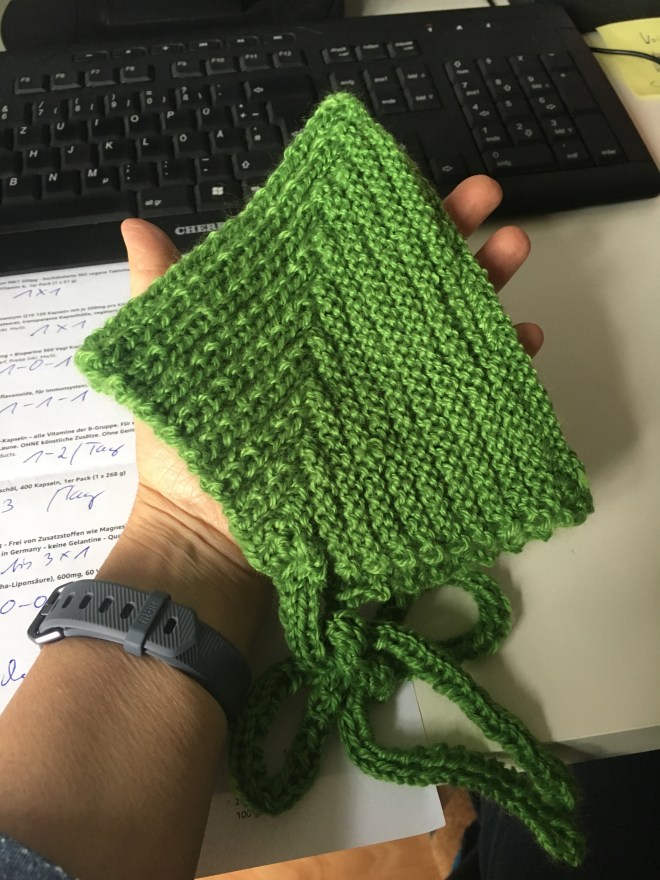 Sieht etwas schief aus am Ende, hat aber offenbar funktioniert. Ich habe mir in den ersten Reihen eine Sicherheitsnadel reingeklemmt an der letzten Masche, die ich „anders“ gestrickt habe (am Anfang und am Ende der Hinreihe), damit ich immer wusste, wo das Ende ist. Das fand ich hilfreich. Und mir gemerkt, wenn ich die letzte Rückreihe rechts gestrickt habe, beginnt die neue Hinreihe auch rechts. Oder eben umgekehrt: die Rückreihe mit linken Maschen beendet, dann die nächste Hinreihe mit linken Maschen starten.
