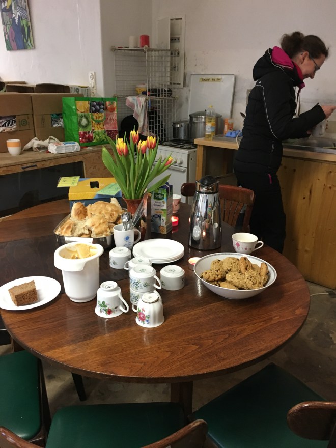 Zur allgemeinen Stärkung wurde Tee, Kaffee, Fladenbrot mit Hummus und allerlei Kuchen angeboten. Gratis oder gegen eine freiwillige Spende. Die Bewohner des Hauses stellten uns sogar noch frische Tulpen auf den Tisch – toll!