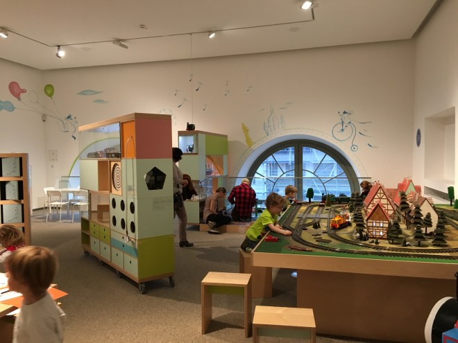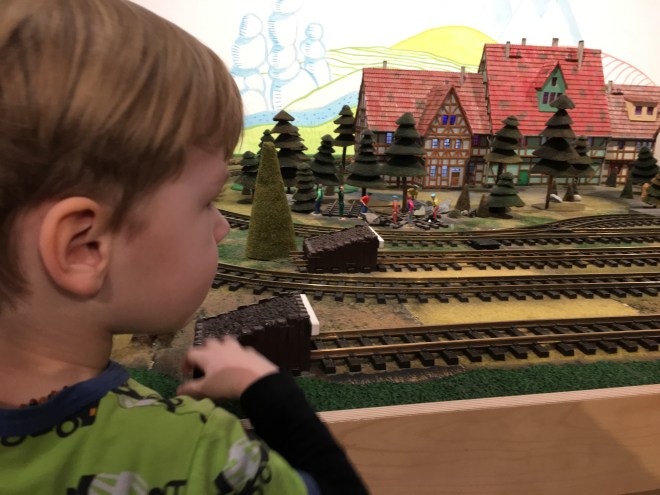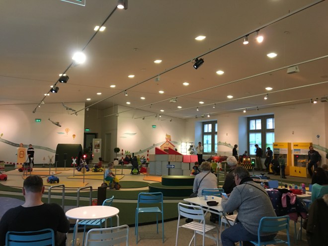 Über die Etagen sind die Ausstellungen thematisch gegliedert nach Verkehrsart. Schifffahrt, Luftschiffe, Eisenbahnen, Straßenverkehr. Überall gibt es Dinge zum Experimentieren und „Be-Greifen“, ich finde das toll. Wenn ich früher in ein Museum ging als Kind, war alles hinter Glas und davor noch eine dicke rote Kordel und man musste leise sein und durfte nicht rennen! Zum Glück sind diese Zeiten vorbei.