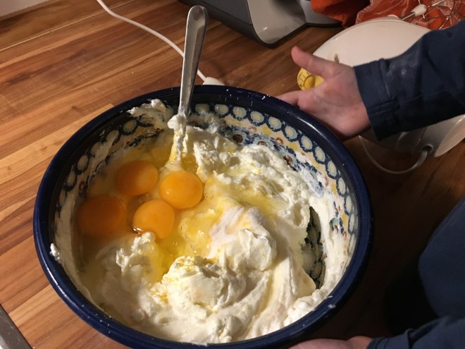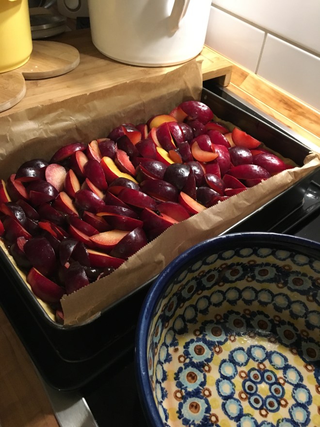 Als wir nach Hause kamen am Abend backte ich einen Pflaumenkuchen – Besuch hatte sich angekündigt für den Sonntag! Erschwerte Bedingungen beim Backen: Ich kriege den Blondino kaum vom Teig, der findet Kuchenbacken total fetzig. Ich finde Kuchenbacken auch total fetzig, allerdings eher alleine 😉