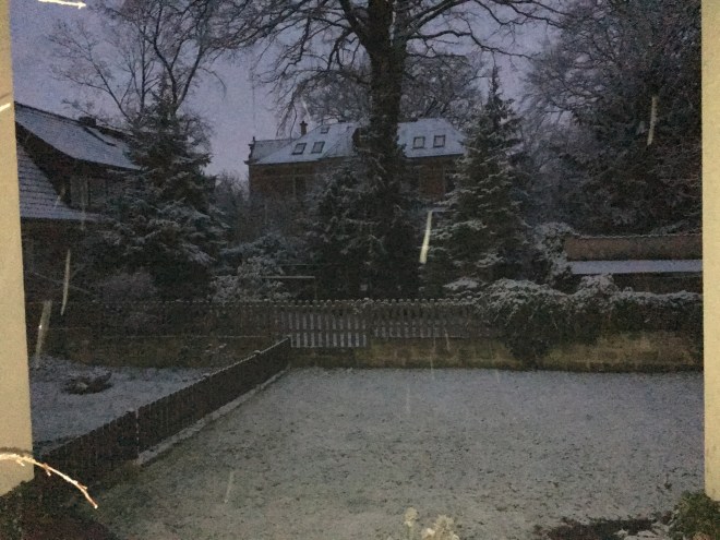 Mittlerweile ist es halb sieben. Draußen Schwarz zu Grau. Es zeigt sich, dass es über Nacht geschneit hat und der „Backer“ ist außer Rand und Band.