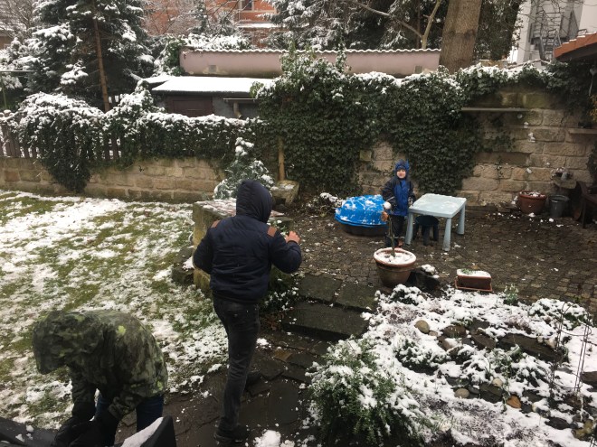 Die Jungs gucken sich den Winter mit seinen Begleiterscheinungen draußen in echt an, ich sehe von drinnen zu. Zumal das Fenster, hinter dem ich mich befinde, stetem Schneeballbeschuss ausgesetzt ist. Kluges Weib verordne ich mir da lieber Stubenarrest.