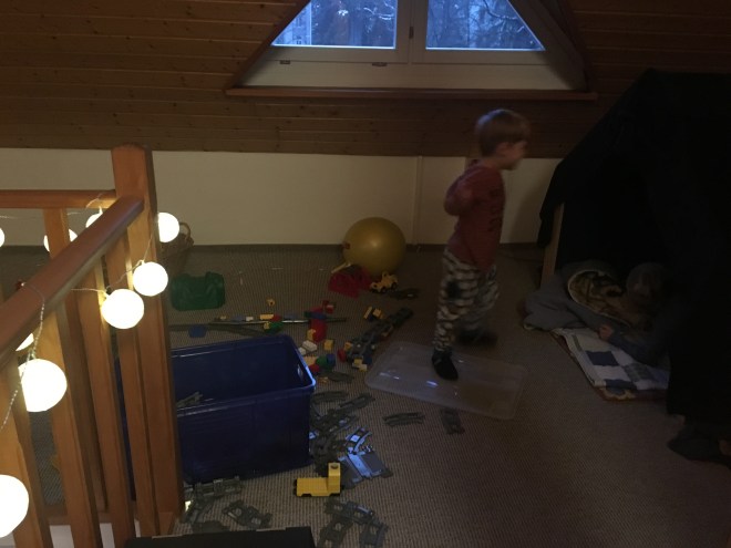 Später am Sonntag: Der Kuchen wurde nur zu einem Drittel verzehrt (ich habe mir wirklich alle Mühe gegeben), die Teigtaschen sind alle und die Kinder auf dem Dachboden müde gespielt.