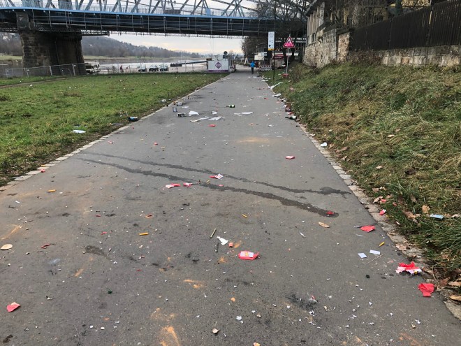 Geputzt wird am ersten Januar nach meinem Beobachten nur bis zur Waldschlösschenbrücke, danach fängt Johannstadt an und das ist nicht so wichtig, ob es dort dreckig ist, und Pieschen? Ach, nach Drecks-Pieschen kommt die Straßenreinigung gar nicht in der ersten Januarwoche! Dort sieht es aus wie nach dem Krieg (oder was unsereiner darunter versteht).