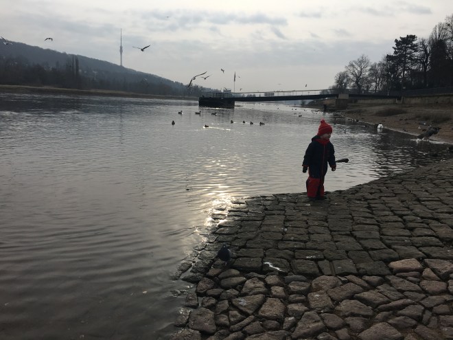 Jedenfalls waren wir mit dem Kind und ohne Hund mit der Dresdner Schwebebahn fahren, die im übrigen die älteste der Welt ist. Das war schön und vor allem entspannend, weil wir früh dran waren und deshalb alleine dort.