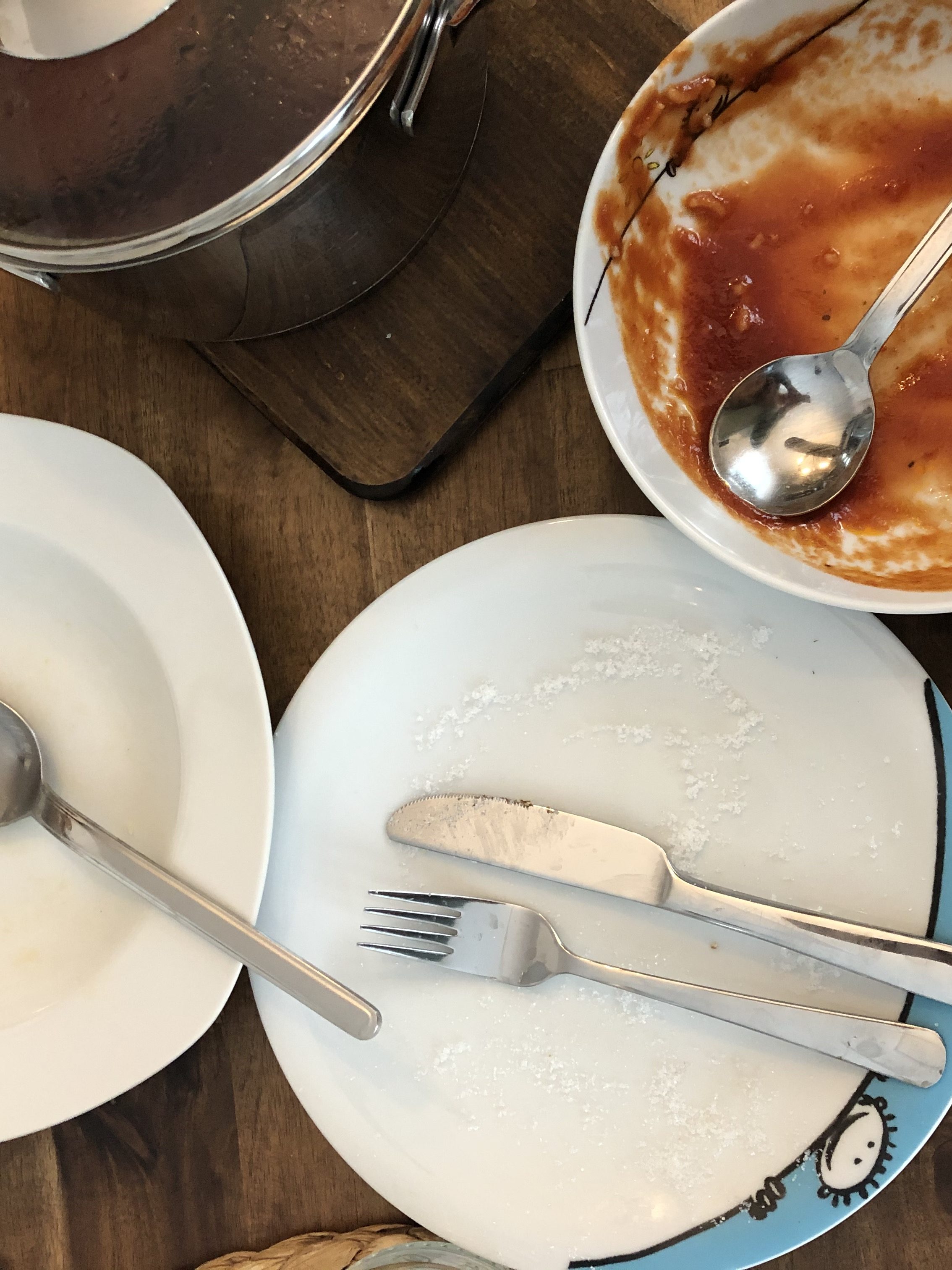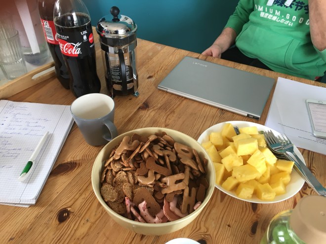 Obstmandalafreier Frühstückstisch. Ja, ich würde auch lieber an einem anderen Tisch sitzen. Life is not a Ponyhof. Iss deine gezuckerten Teigwaren und halt die Klappe, Nieselpriem.
