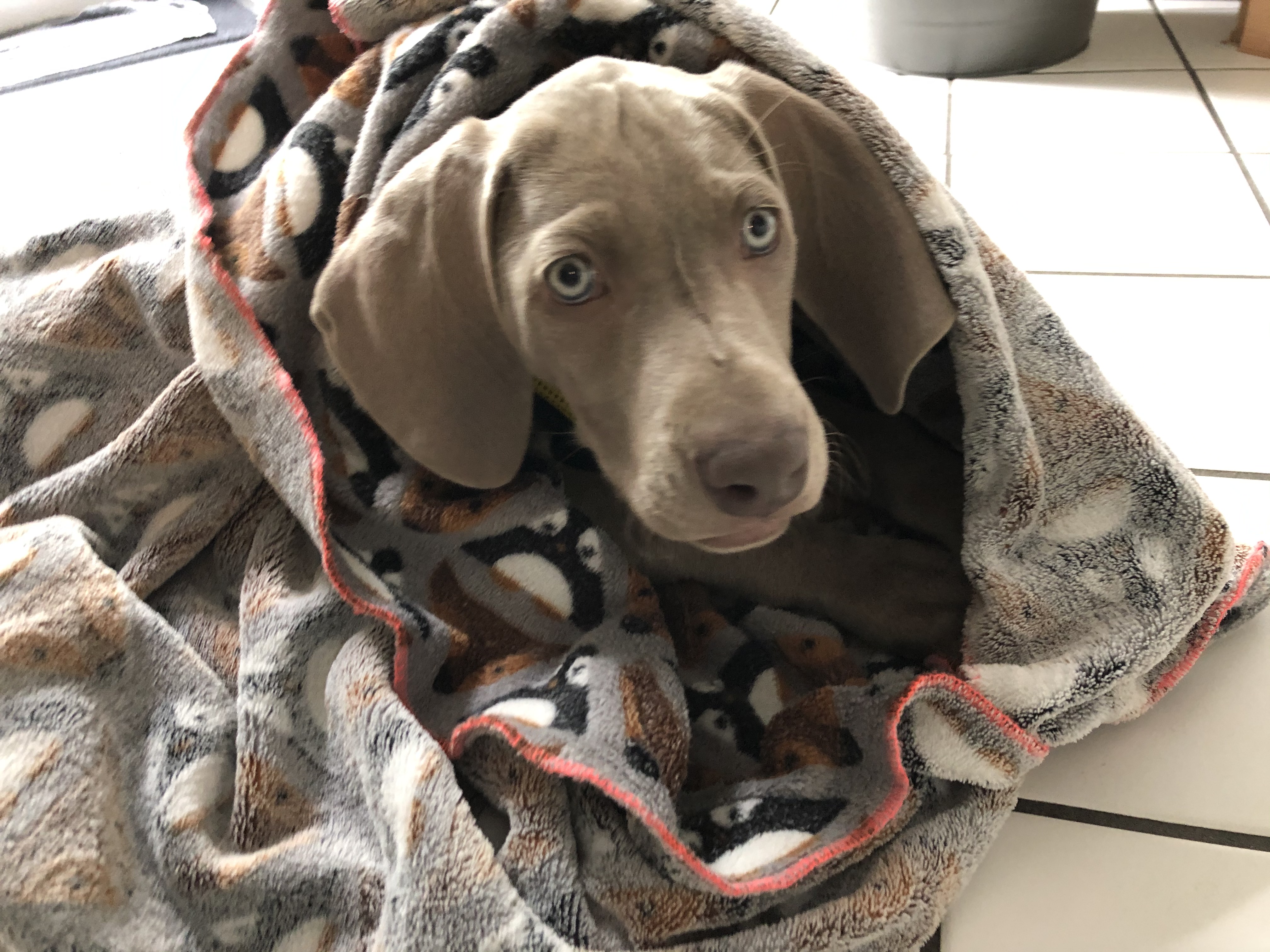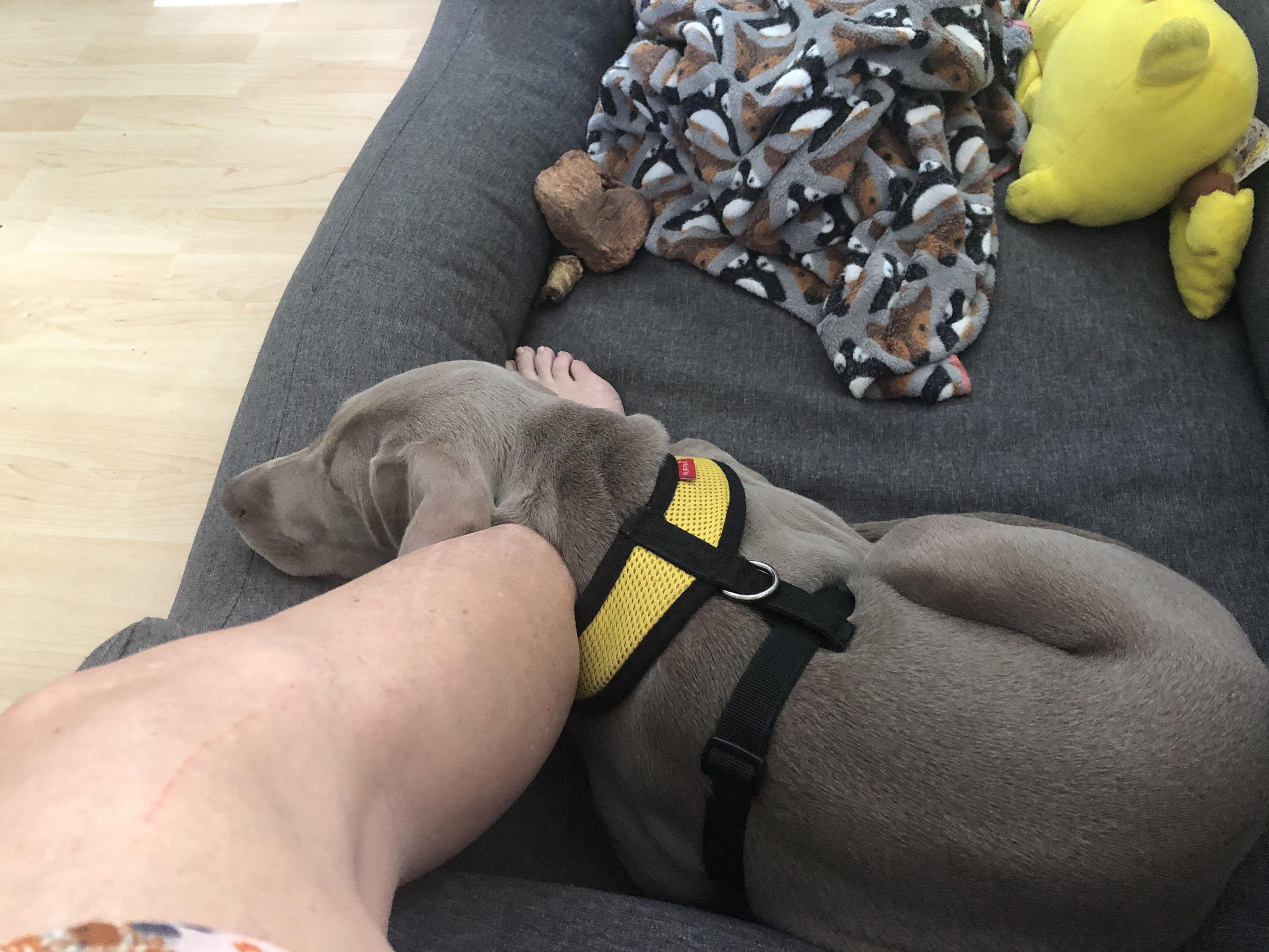Der Weimaraner denkt, er sei wahlweise ein galoppierendes Rennpferd in Miniatur oder eine Katze, die sich sofort auf jedem Schoß einrollt, der sich ihr bietet. Außerdem zeigt sie das unmögliche Verhalten, dass sie jeder fremden Person auf der Straße, die sich hinhockt und das Hundchen anspricht, um den Hals fällt und sie abschleckert. Ich empöre mich! Hauptsächlich über die übergriffigen Menschen, aber der Hund kriegt auch sein Fett ab. Also wer gerne von unserem Hundebaby geknutscht werden will, sollte sich auch beeilen, das trainieren wir der ab!