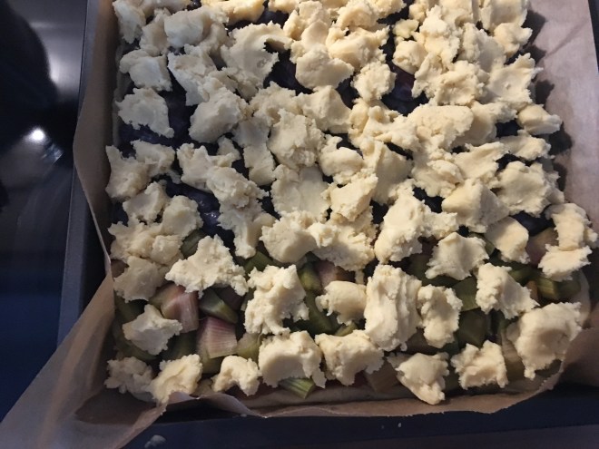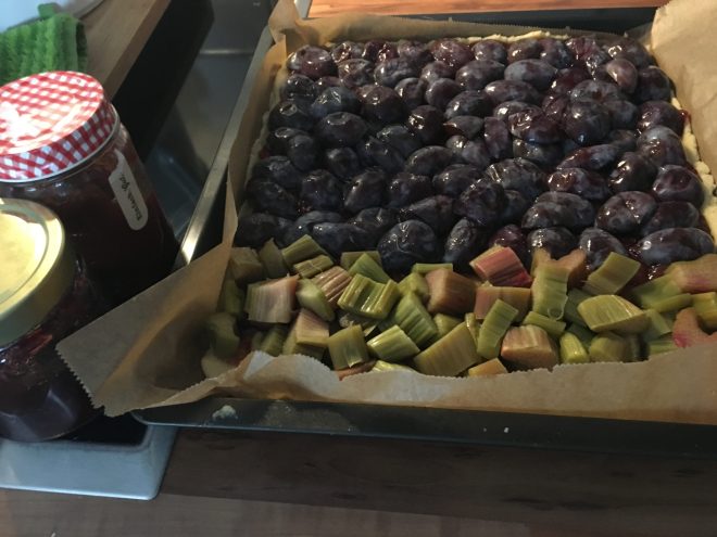 Unter die Pflaumen habe ich Pflaumenmus geschmiert, der Rhabarber bekam ein Bett aus Erdbeermarmelade.